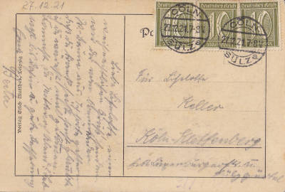 Ortspostkarte vom 27.12.1921 (6. Periode) frankiert mit 3 Marken a 10 Pfennig (=30 Pfennig) |