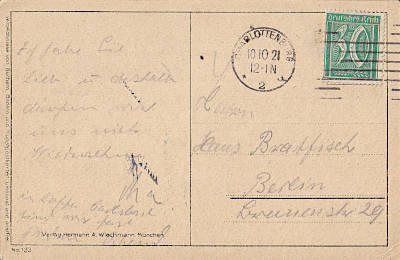 Ortspostkarte vom 10.10.1921 (6. Periode) frankiert mit einer Marke a 30 Pfennig (=30 Pfennig) |