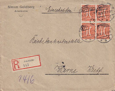 Inlandsbrief mit Einschreiben (1-20 g) vom 28.09.1921 (6. Periode) frankiert mit 4 Marken a 40 Pfennig (=1,60 Mark, 0,60 Brief 1 Einschreiben) |