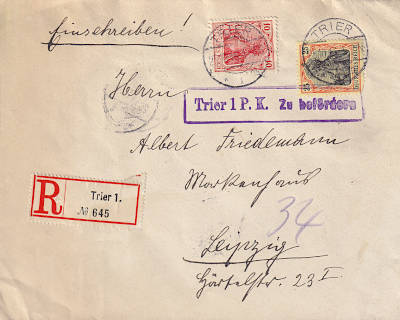 Inland cover with registeration (1-20 g) from 15.03.1917 franked with 3 stamps (=35 Pfennig, 15 cover 20 registeration)