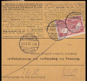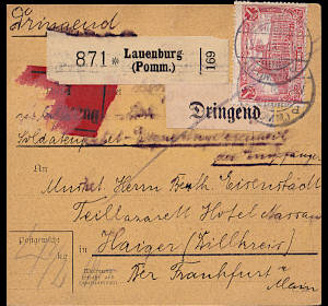 (5 000 g, > 75 km) from 27.08.1917 franked with 2 stamps a 50 Pfennig (=1 Mark, 0,60 parcel 0,40 special delivery)