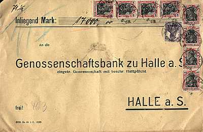 Inland cover with value (17 000 Mark) (71,5 g, < 75 km) from 05.08.1918 franked with 9 stamps (=3,35 Mark, 0,25 cover 3,15 value)