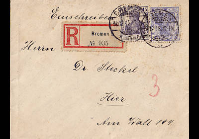 Local cover with registeration (21-250 g) franked with 2 stamps (=35 Pfennig, 15 cover 20 registeration) |