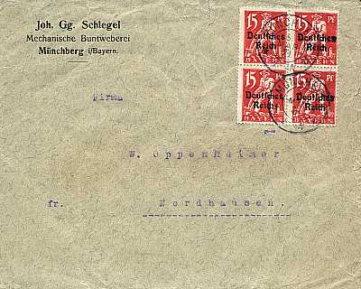 Inland cover (21-250 g) from 05.03.1921 franked with 4 stamps a 15 Pfennig (=60 Pfennig) |