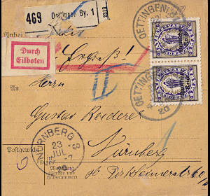Inlandspaketkarte mit Eilzustellung (6 000 g, < 75 km) vom 22.07.1920 frankiert mit 2 Marken a 2 Mark (=4 Mark, 2,50 Paket 1,50 Eilzustellung) |