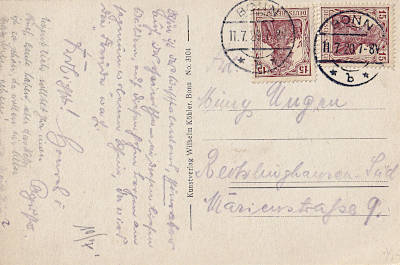 Inlandspostkarte vom 11.07.1920 frankiert mit 2 Marken a 15 Pfennig (=30 Pfennig) |