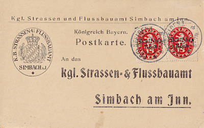 Inlandspostkarte vom 14.05.1920 frankiert mit 2 Marken a 15 Pfennig (=30 Pfennig) |