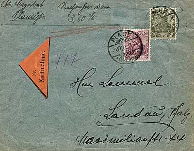 Inland parcel card with cash on delivery (5 000 g, > 75 km) from 07.10.1921 franked with one stamp a 5 Mark on 75 Pfennig (=5 Mark, 4 parcel 1 cash on delivery) |