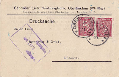 Inland printed matter card from 03.12.1921 franked with 2 stamps a 5 Pfennig(=10 Pfennig)