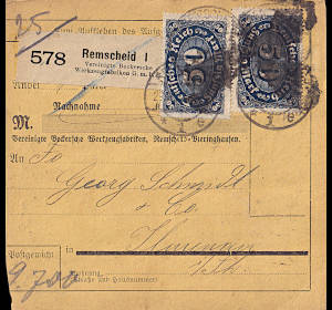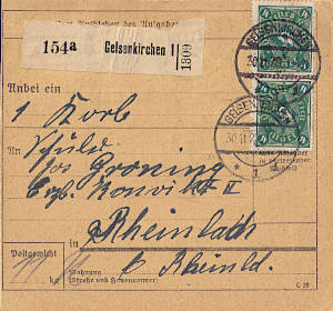 Inlandspaketkarte (9 700 g, > 75 km) vom 29.11.1922 frankiert mit 19 Marken (=240 Mark) |
