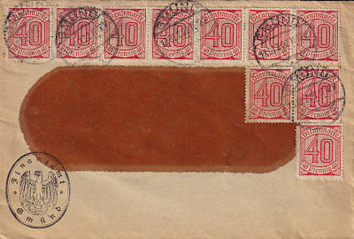 Local cover (1-20 g) from 13.12.1922 franked with 10 stamps a 40 Pfennig (=4 Mark)