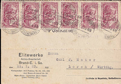 Inlandspostkarte vom 12.01.1923 frankiert mit 6 Marken a 2,50 Mark (=15 Mark) |