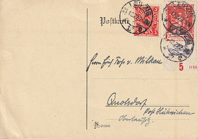 Inlandspostkarte vom 03.01.1923 frankiert mit 3 Marken a 5 Mark (=15 Mark) |