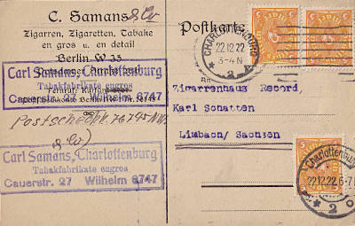 Inlandspostkarte vom 22.12.1922 frankiert mit 3 Marken a 5 Mark (=15 Mark) |