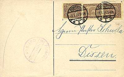 Inlandspostkarte vom 25.12.1922 frankiert mit 3 Marken a 5 Mark (=15 Mark) |