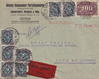 Foreign cover with special delivery (1-20 g) from 21.02.1923 franked with 8 stamps(=450 Mark, 150 cover 300 special delivery)