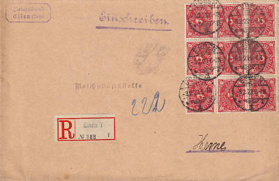 Inlandsbrief mit Einschreiben (1-20 g) vom 03.02.1923 frankiert mit 9 Marken a 10 Mark (=90 Mark, 50 Brief 40 Einschreiben) |