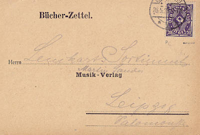 Inlandsbücherzettel (1-25 g) vom 26.05.1923 frankiert mit einer Marke a 20 Mark (=20 Mark) |