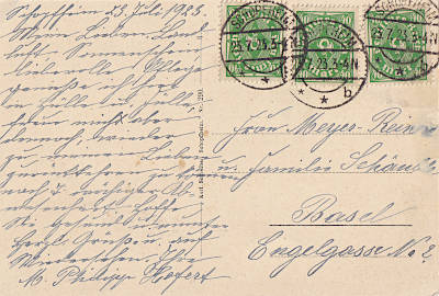 Auslandspostkarte vom 23.07.1923 frankiert mit 3 Marken a 40 Mark (=120 Mark); in die Schweiz galt bis 30 km der Inlandstarif