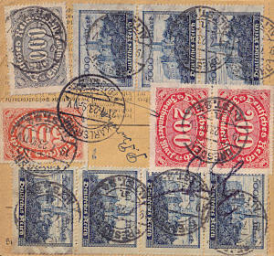 Inland parcel card with value (4 Million Mark) (2 510 g, > 75 km) from 19.07.1923 franked with 12 stamps (=41 900 Mark, 1 600 parcel 300 registeration 40 000 value)
