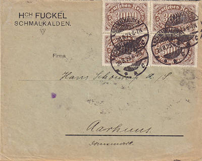Auslandsbrief (1-20 g) vom 29.08.1923 frankiert mit 6 Marken a 10 000 Mark (=60 000 Mark) |