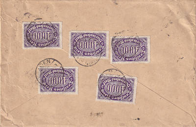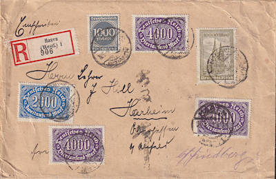 Inlandsbrief mit Einschreiben (1-20 g) vom 25.08.1923 frankiert mit 10 Marken a 4 000 Mark (=40 000 Mark, 20 000 Brief 20 000 Einschreiben) |