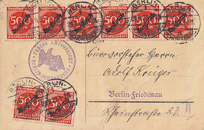 Ortspostkarte vom 29.08.1923 frankiert mit 8 Marken a 500 Mark (=4 000 Mark)