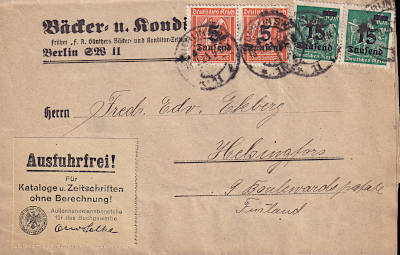 Auslandsdrucksache (1-50 g) vom 19.09.1923 frankiert mit 5 Marken a 8 000 Mark auf 30 Pfennig (=40 000 Mark)
