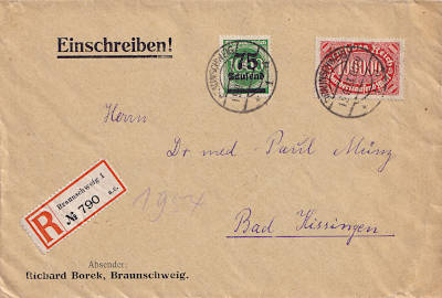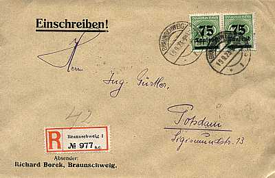 Inland cover with registeration (1-20 g) from 19.09.1923 franked with 2 stamps a 75 000 Mark on 400 Mark (=150 000 Mark, 75 000 cover 75 000 registeration)