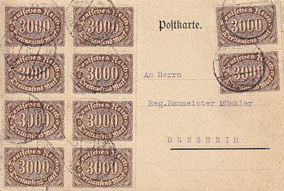 Inlandspostkarte vom 07.09.1923 frankiert mit 10 Marken a 3 000 Mark (=30 000 Mark) |
