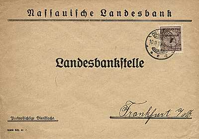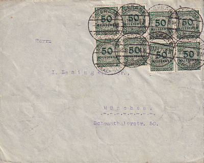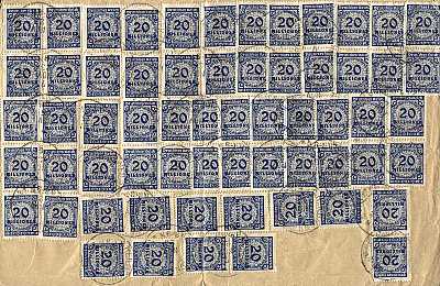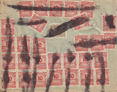 Inland cover (21-100 g) from 06.11.1923 franked with 55 stamps (=1,4 Billion Mark) |