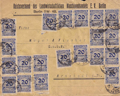 Inlandsbrief (1-20 g) from 11.11.1923 franked with 50 stamps a 20 Million Mark (=1 Billion Mark) |