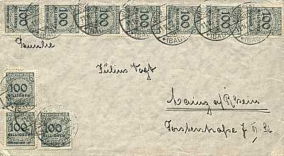 Inland cover (1-20 g) from 11.11.1923 franked with 10 stamps a 100 Million Mark (=1 Billion Mark) |