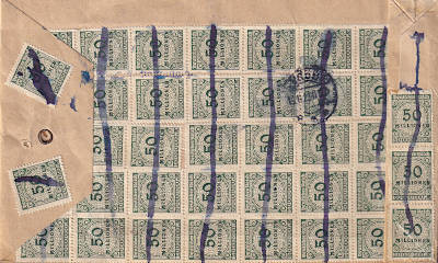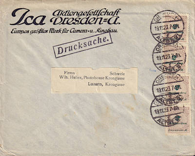 Auslandsdrucksache (51-100 g) vom 13.11.1923 frankiert mit 54 Marken (=16 Milliarden Mark)