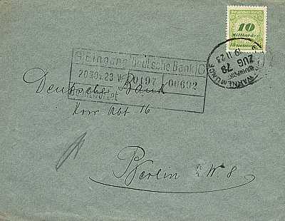 Inland cover (1-20 g) from 19.11.1923 franked with one stamp a 10 Billion Mark (=10 Billion Mark) |