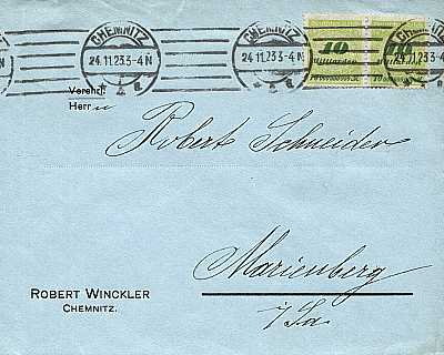 Inland cover (1-20 g) from 20.11.1923 franked with 2 stamps a 10 Billion Mark on 50 Million Mark (=20 Billion Mark) |