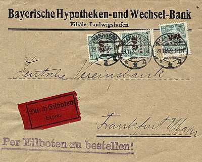 Inlandsbrief mit Eilzustellung (1-20 g) vom 28.11.1923 frankiert mit 6 Marken a 10 Milliarden Mark auf 50 Millionen Mark