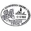 Einellipsenstempel mit Kurzsteg und Strich (bo3zbu) "SCHWÄBISCH GMÜND 1/ (Johanniskirche)/ (zwei Radfahrer) (Datum)/