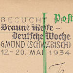 "BESUCHT DIE/ Braune Messe -/ Deutsche Woche/ GMÜND (SCHWÄBISCH)/ 12. - 20. MAI 1934"; Einkreisstempel (bo3z) "GMÜND (SCHWÄBISCH)/ (Datum)/ 1"