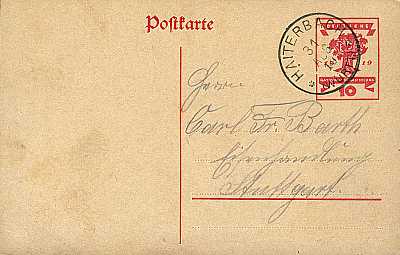 Inlandspostkarte vom 31.08.1919 (3. Periode) frankiert mit einem Wertstempel a 10 Pfennig (=10 Pfennig)
