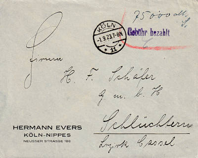 Köln 11: Inlandsbrief (1-20 g) vom 01.09.1923 mit violettem Einzeiler (z) "Gebühr bezahlt" und handschriftliche Gebührenhöhe "75 000 M." |