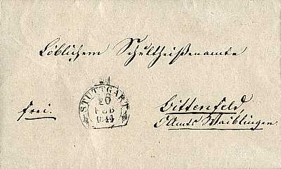 | schwarzer Kreissegmentstempel mit Kreis "STUTTGART/ 20 FEB 1844" auf Brief nach Bittenfeld |