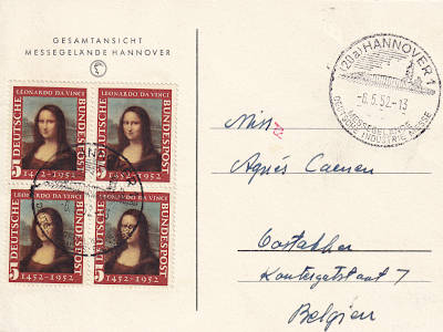 Auslandspostkarte frankiert mit 4 Marken Mona Lisa