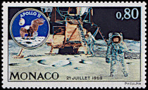 Astronaut and lunar mod-ule on the moon, mission patch of Apollo 11