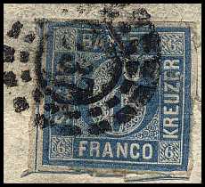 Badenfehldruck: Farbfehldruck einer 9 Kreuzer Briefmarke aus Baden 1851 ge-druckt auf blaugrünem anstatt rosa Papier |