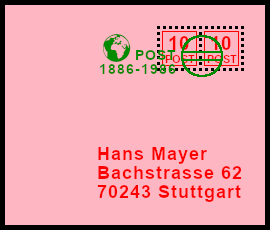 Maschinenstempel mit Datumsfälschung: echter Maschinen- stempel bei dem in betrügerischer Absicht nicht das Tagesdatum sondern ein anderes Datum eingestellt wurde (Vor- oder Rückdatierung) |