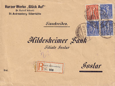 Four-Times-Value Franking: postal ship-ment from the German Empire between November 26th and 30th 1923 in which the postage stamps were used at four times the face value (e. g. postcard 40 billion mark) |