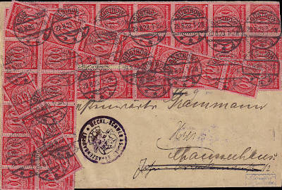 Mass Franking: postal shipment franked with plenty of postage stamps due to a lack of suitable high value stamps or as a philatelic gimmick |