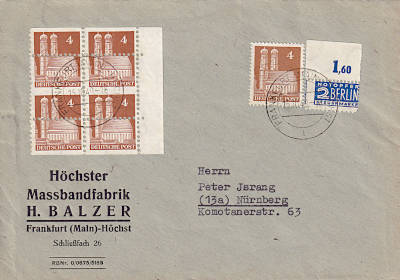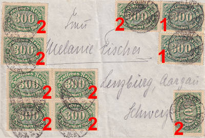 Mischfrankatur: frankiert mit Briefmarken mit 2 unterschiedlichen Wasserzeichen (2 x Wz. 1 Rauten, 8 x Wz. 2 Waffeln) |