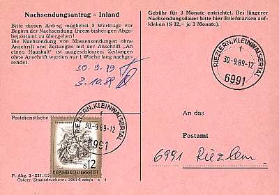 Hinweisvermerk Nachsendungsantrag: Vermerk der auf eine Sonderleistung hin-weist mit dem ein Empänger die Post beauf-tragt die an ihn gerichteten Postsendungen an seine neue Anschrift weiterzuleiten |